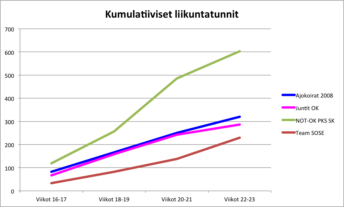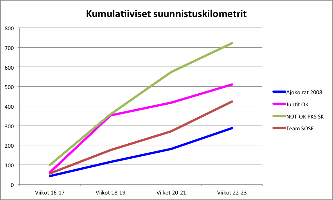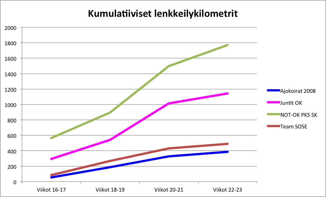 Kumulatiivisessa graafissa NOK:lla tapahtui tällä jaksolla pieni notkahdus, muiden koventaessa treenimääriä kohti Jukolaa.