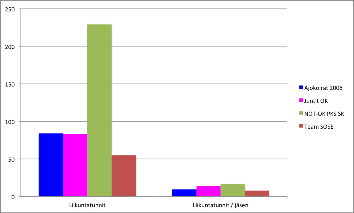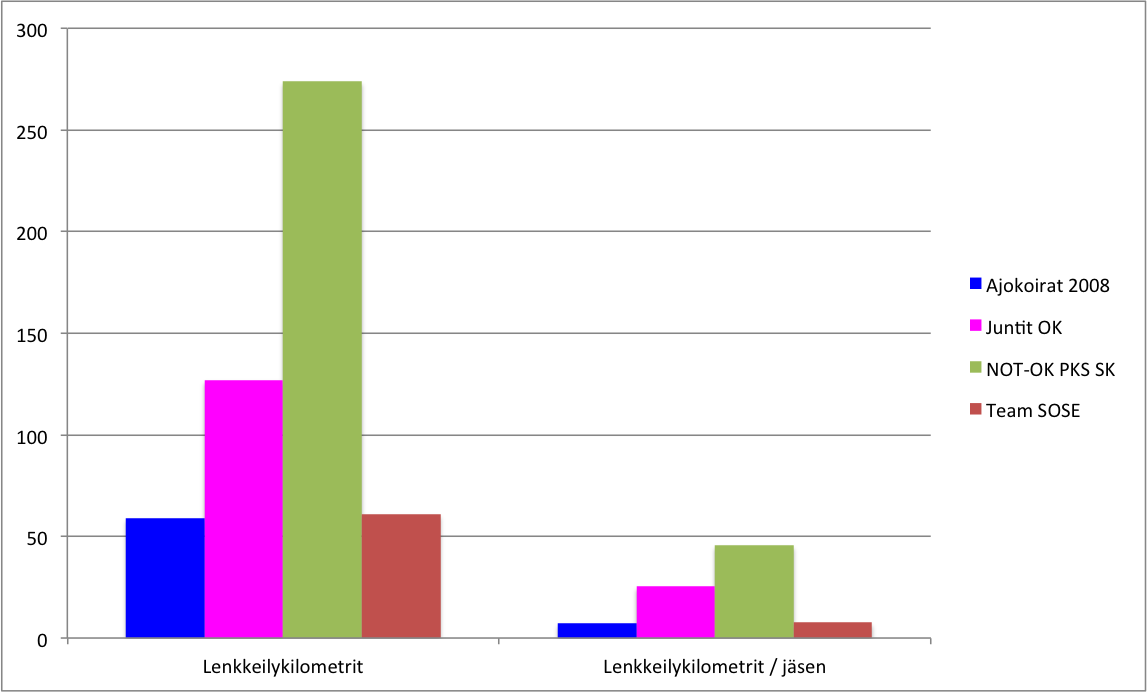 | Ajokoirat 2008 | 8,25 | 320 tuntia | 38,79 tuntia | 385 km | 46,67 km | 287,5 km | 34,85 km |