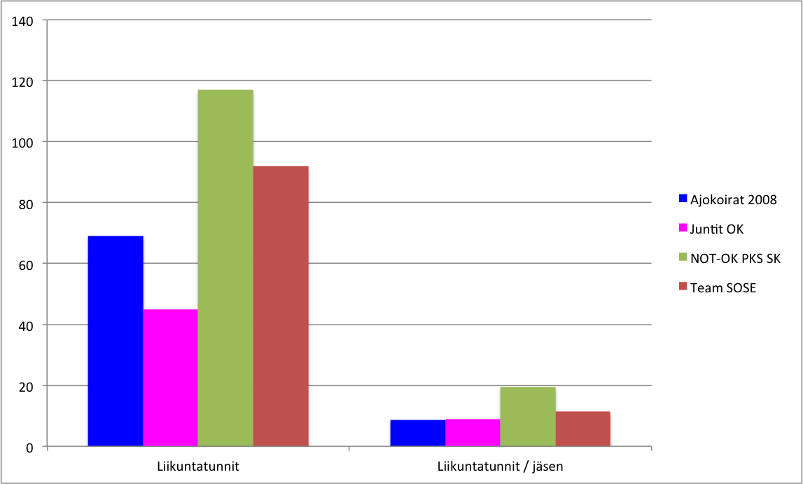 Jäsenkohtaisissa liikuntamäärissä NOT-OK PKS SK teki kovat pohjat 19,50 keskimääräisellä liikuntatunnilla per jäsen, joka on lähes tuplat alkuperäiseen 5h/vko/jäsen tavoitteeseen nähden. Toisena jäsenkohtaisissa tilastoissa oli Team SOSE 11,50 tunnin tuloksella. Myös SOSE pääsi mukavasti tavoitteeseen. Ajokoirat (8,63 tuntia / jäsen) ja Juntit (9 tuntia / jäsen) jäivät tällä jaksolla tavoitteen alle.