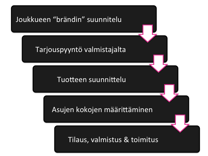 Tarjouspyyntöön liittyen joukkueen pitää miettiä, mitä tuotteita tarvitaan ja kuinka paljon. Tuotteista saa tietoa muun muassa eri valmistajien nettisivuilta ja monesti joukkueen jäsenillä on jo käytössään tuotteita, joista vain halutaan tehdä oma versio joukkueen väreillä.